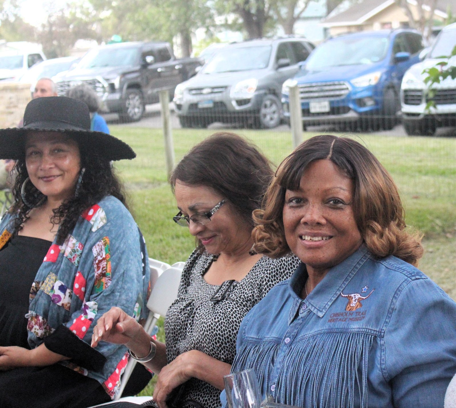 (Photo by Pat Trevino) Left to Right Guests Isabel Patton, Cynthia Orozco, and Angie B. enjoy a relaxed moment during the November 1, 2025 celebration of Robert Leon Oliver’s life and legacy—gathered in fellowship, reflection, and gratitude on the museum grounds in Cuero, Texas.