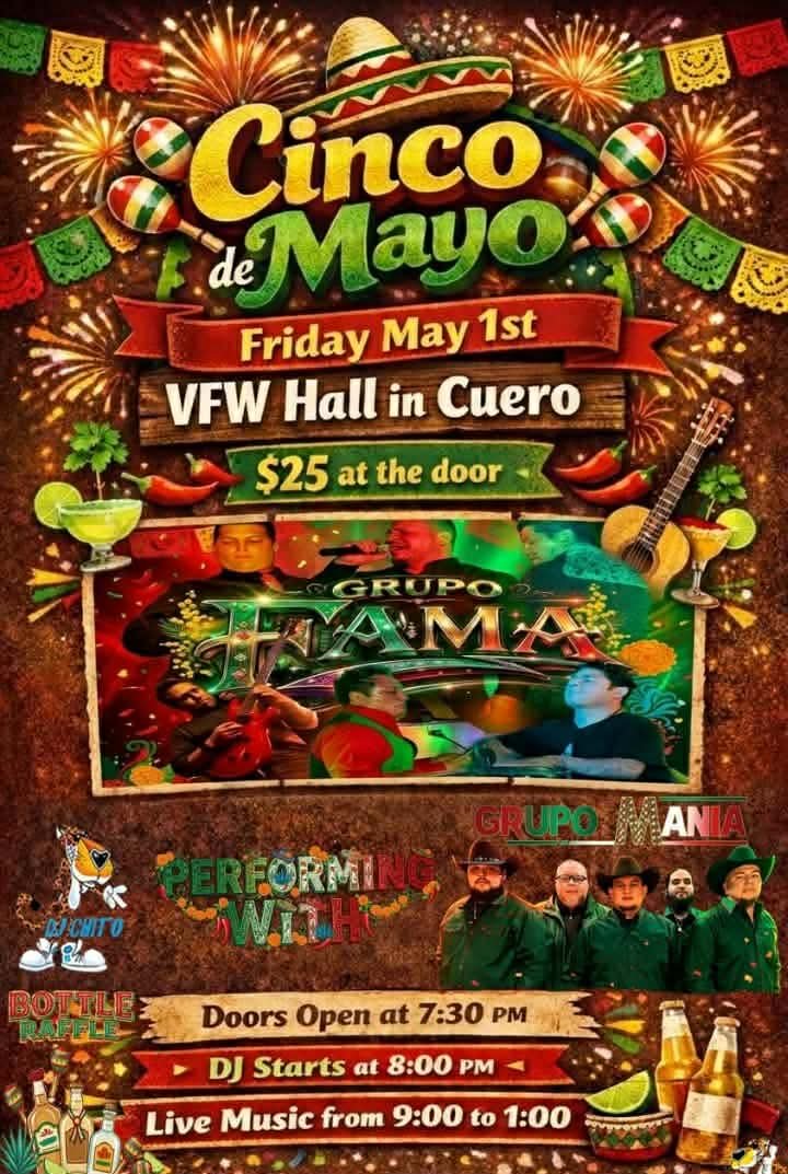 The public is invited to kick off Cinco de Mayo weekend with a night of live music, dancing, and celebration at the VFW Hall on Friday, May 1. The event will feature performances by Grupo Fama along with Grupo Manía, bringing high‑energy Tejano and Latin rhythms to the dance floor.