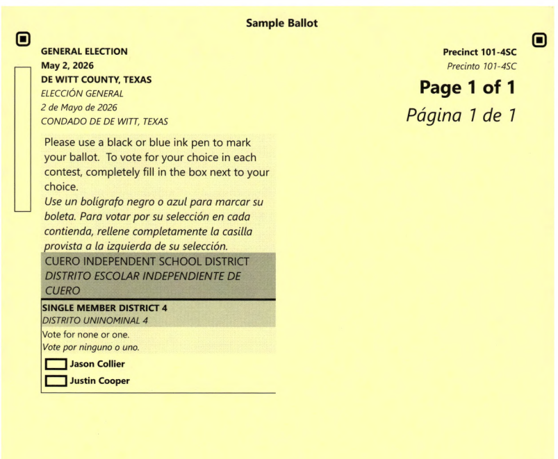 Cuero ISD will hold its Board of Trustees Election on Saturday, May 2, 2026, with two district seats on the ballot. Early voting runs April 20–28, 2026 at the DeWitt County Annex Courtroom, located at 115 N. Gonzales St., Cuero, Texas.