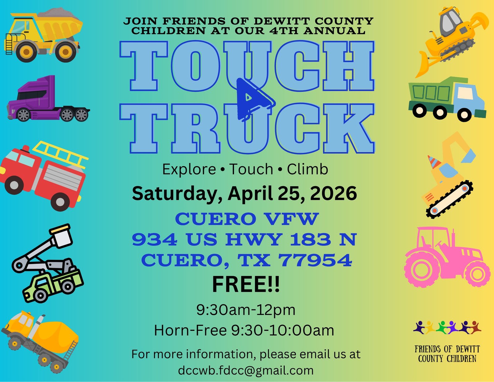 CUERO, TX – Families across DeWitt County are invited to a hands‑on morning of fun as the Friends of DeWitt County Children present their 4th Annual “Touch A Truck” event on Saturday, April 25, 2026. The event will take place from 9:30 a.m. to 12:00 p.m. at the Cuero VFW, located at 934 US Highway 183 North.