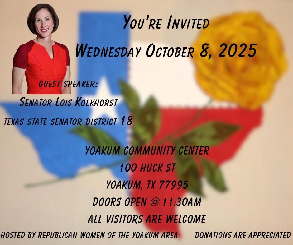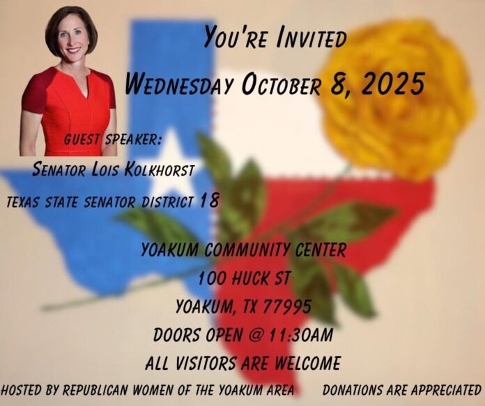The Republican Women of the Yoakum Area will host Texas State Senator Lois Kolkhorst on Wednesday, October 8, 2025, at the Yoakum Community Center, located at 100 Huck Street. Doors open at 11:30 AM, and all visitors are welcome, regardless of political affiliation.