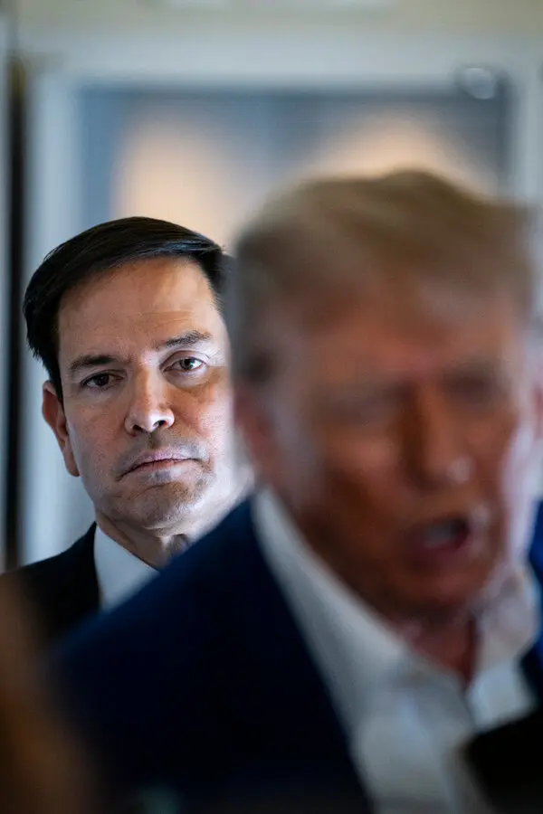 Marco Rubio and blurred image of President Trump.