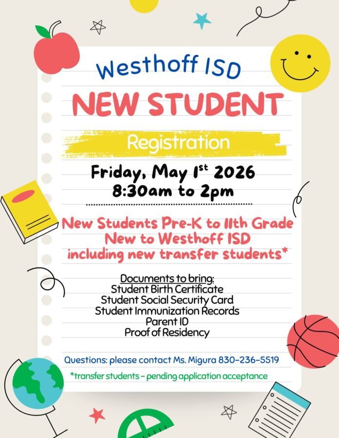 Westhoff ISD has announced its New Student Registration Day for the upcoming 2026–2027 school year. The district will welcome new students on Friday, May 1, 2026, from 8:30 a.m. to 2:00 p.m. on the Westhoff ISD campus.